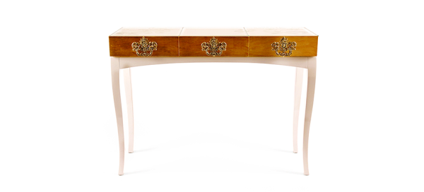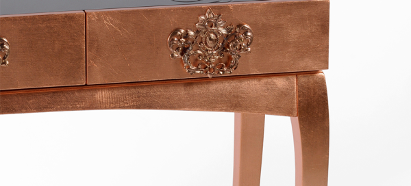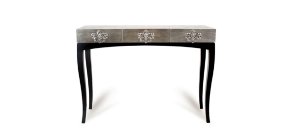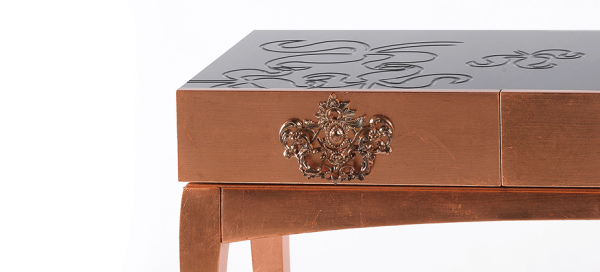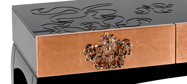 TrinityPRODUCT FEATURES : A black glass box with floral etched accents encases three wood drawers with brass hardware, and is supported by handcrafted wood legs. PRODUCT OPTIONS : Drawers: Gold or silver leaf finished with a high gloss varnish, copper leaf is also available with an upcharge. Hardware: Handcrafted brass in natural brass or plated with chrome, copper plating is available with an upcharge.Legs: High gloss colored lacquer in black or white, custom colors available with an upcharge. Gold or silver leaf finished with a high gloss varnish, copper leaf available with an upcharge. Dimension : WIDTH 1180 x DEPTH 400 x HEIGHT 870mm |