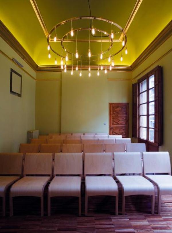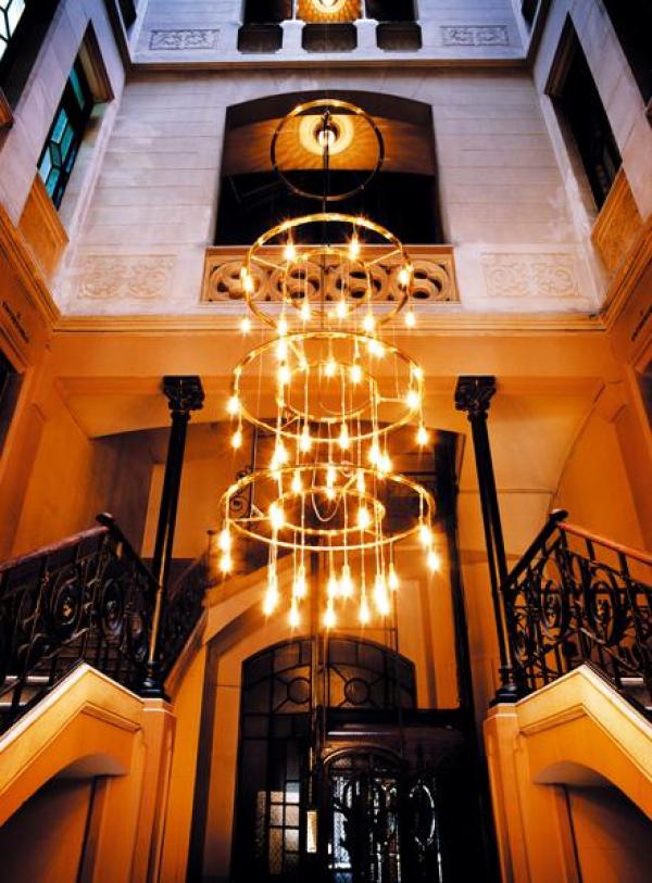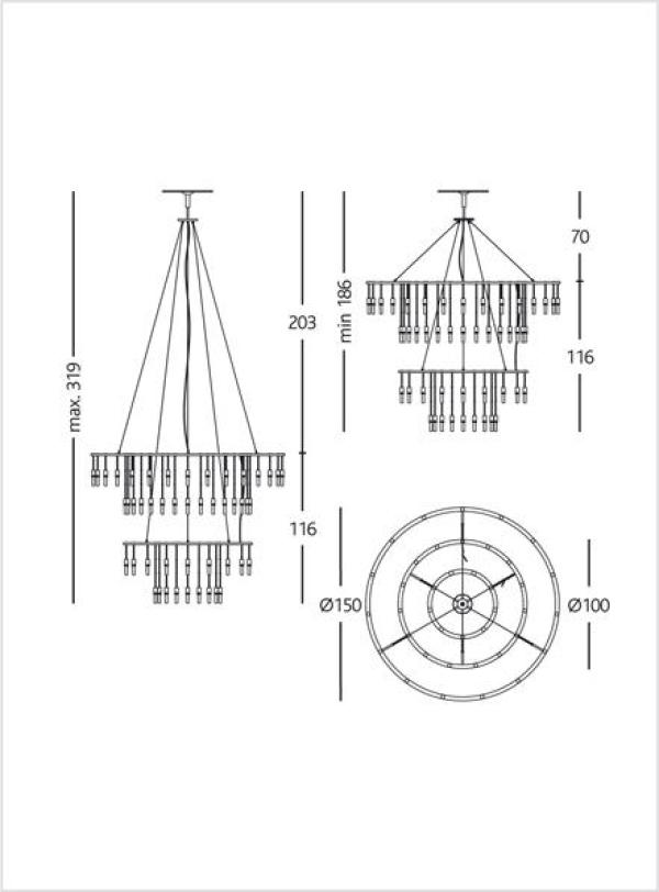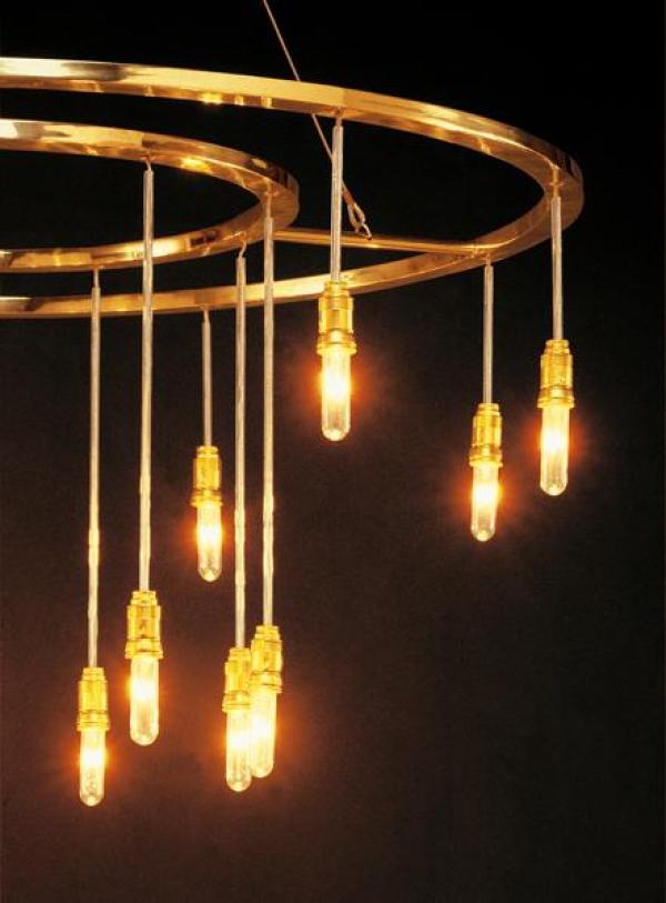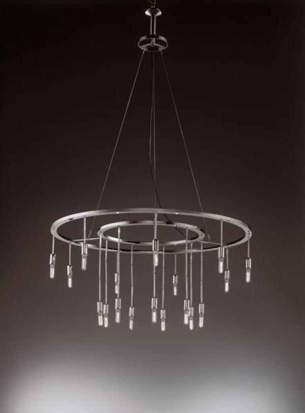 Vague Stelle lampStructure and bulbholders in polished and varnished brass or chromed brass. Pyrex tubes and stainless steel braided wires. Tubular transparent bulbs E-14 of max. 25W/each one, 230V/50Hz. - Single lamp, of Ø150cm (30 bulbs) and of Ø100cm (18 bulbs). For high ceilings, with Ø15cm rosette and for low ceilings with Ø3’2cm rosette. - Double lamp of Ø150-100cm (48 bulbs), with Ø15cm rosette. - Triple lamp of Ø100-100-100cm (54 bulbs) and Ø150-150-150cm (90 bulbs), with Ø3’2cm rosette. Certified CE UNE-EN 60598-1. Launch : 1983